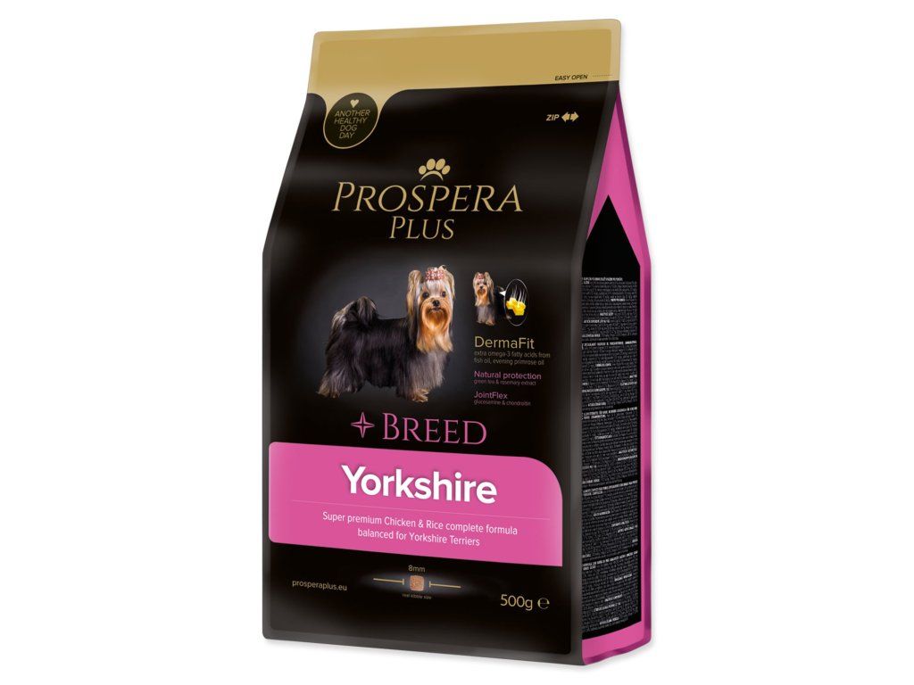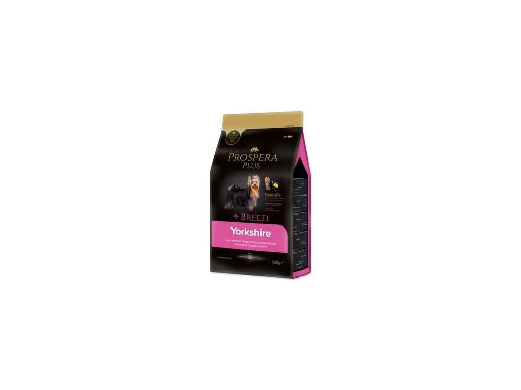 PROSPERA PLUS Yorkshire je superpremiové krmivo, navržené s ohledem na unikátní výživové potřeby plemene Yorkshirský teriér. Základem receptury je kvalitní lehce stravitelné kuřecí maso doplněné o rybí tuk (omega 3 mastné kyseliny) a pupalkový olej, které podporují zdravou srst tohoto plemene. Funkční přísady extrakt ze zeleného čaje a rozmarýnu posilují imunitu pejsků. Chondroprotektiva glukosamin a chondroitin pomáhají posilovat a stabilizovat kosti a klouby.Speciální tvar granulí pomáhá k prevenci před zubním kamenem a plakem.