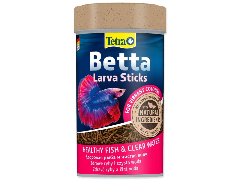 Nové krmivo Tetra Betta Larva Sticks nabízí druhově odpovídající krmivo, které ideálním způsobem pokrývá nutriční potřeby tropických ryb rodu betta a jiných labyrintek. Toto speciální krmivo připomíná svou velikostí, tvarem a barvou komáří larvy, jednu z nejoblíbenějších rybích pochoutek. Toto nové speciální krmivo je ideální k vytvoření přirozených podmínek rybám v akváriu: krmivo plave na hladině vody. Osahuje velice chutné krevetky a vysoký obsah karotenoidů, čímž posiluje zářivé zbarvení ryb. Vysoce kvalitní bílkoviny a omega-3 mastné kyseliny poskytují dostatečnou energii pro zajištění zdravého růstu. BioActive formule pomáhá udržovat rybám zdravý imunitní systém a zvyšuje jejich odolnost, energii a vitalitu.