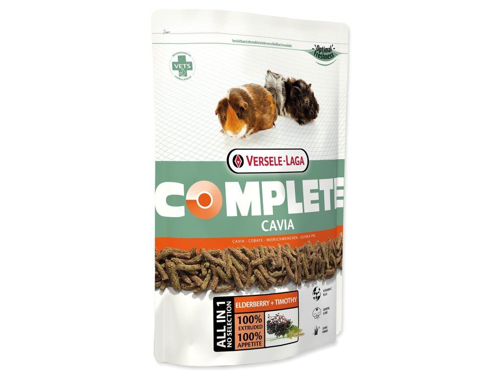 - Fresh Vegetables (čerstvá zelenina): Proces extruze umožňuje přidávat do pelet čerstvou zeleninu. Přídavek nejméně 10 % čerstvé zeleniny zajišťuje lahodnou chuť pelet. To v kombinaci s vlákninou a texturou činí z Cavia Complete krmivo pro morčata s vysokým stupněm poživatelnosti.