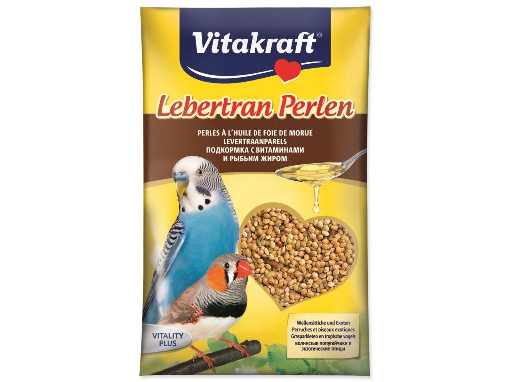 Doplňkové krmivo s olejem z tresčích jater k podpoře vitality pro andulky, malé papoušky a okrasné ptactvo.
