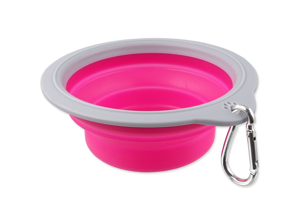 Cestovní miska skládací. Vyrobena z odolného materiálu silikonu, snadno složitelná do kompaktních rozměrů. Vhodná na cesty a dlouhé procházky. Nepřijímá pachy a snadno se udržuje. Odolná proti nárazům a mrazu. Obsahuje karabinu pro uchycení na batoh nebo oblečení.