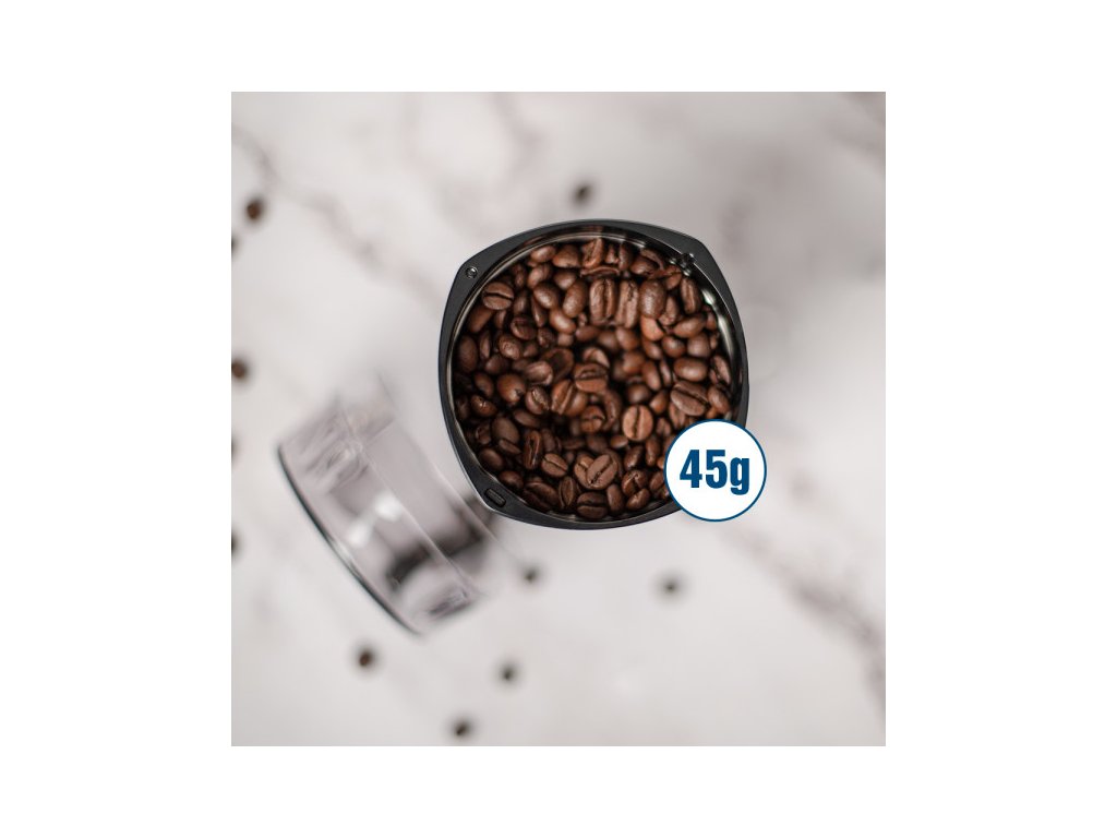 Tento elegantní kávomlýnek má nůž z kvalitní nerezavějící oceli a výkonný 180 W motor, kterým dokáže umlít zrnka kávy přesně podle vašich představ. Mimořádně účelný kávomlýnek Orava KM 803 dokáže obsáhnout 45 gramů kávových zrn na jedno mletí (cca 6 šálků kávy), díky čemuž budete mít svou kávovou směs předem připravenou i na další porce.