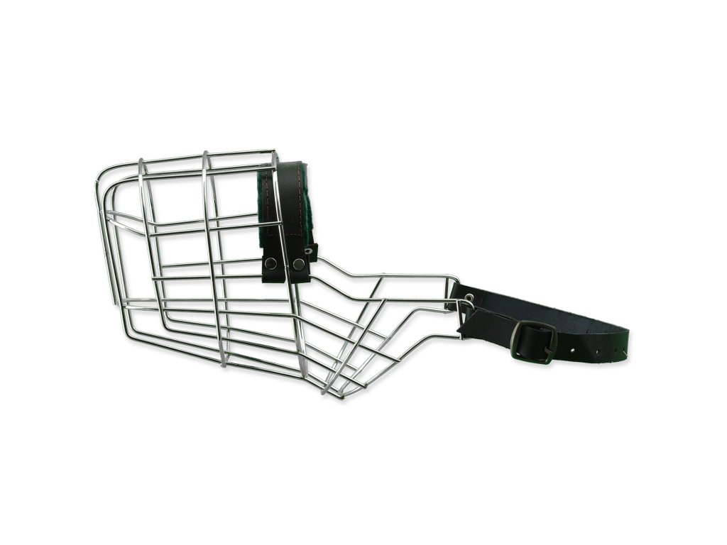 Kovový náhubek s koženými řemínky na zapínání.