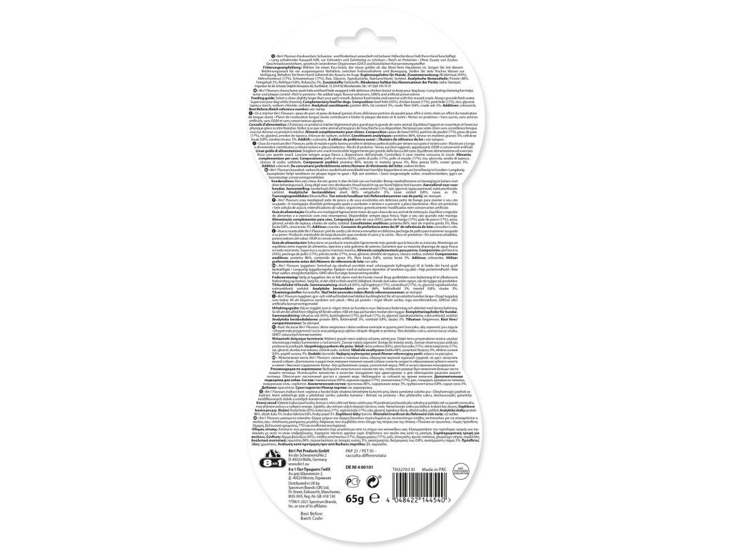 Složení: maso a vedlejší produkty živočišného původu (52% hovězí kůže, 25% vepřová kůže, 8% kuřecí prsa), vedlejší produkty rostlinného původu, minerální látky.
