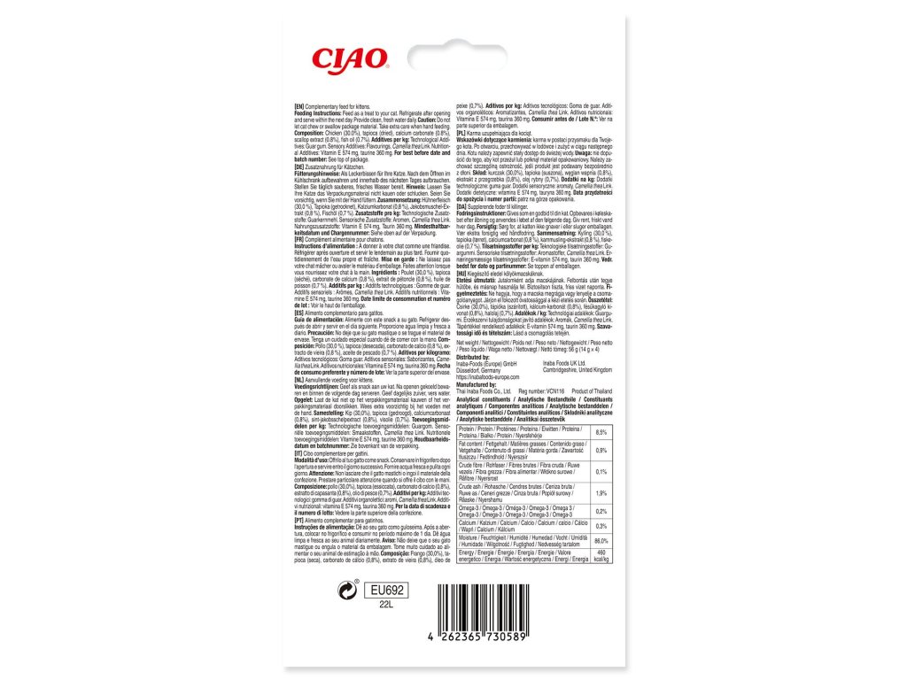 Chutná lízací pochoutka pro koťata s obsahem vápníku ve formě pyré z kuřete.