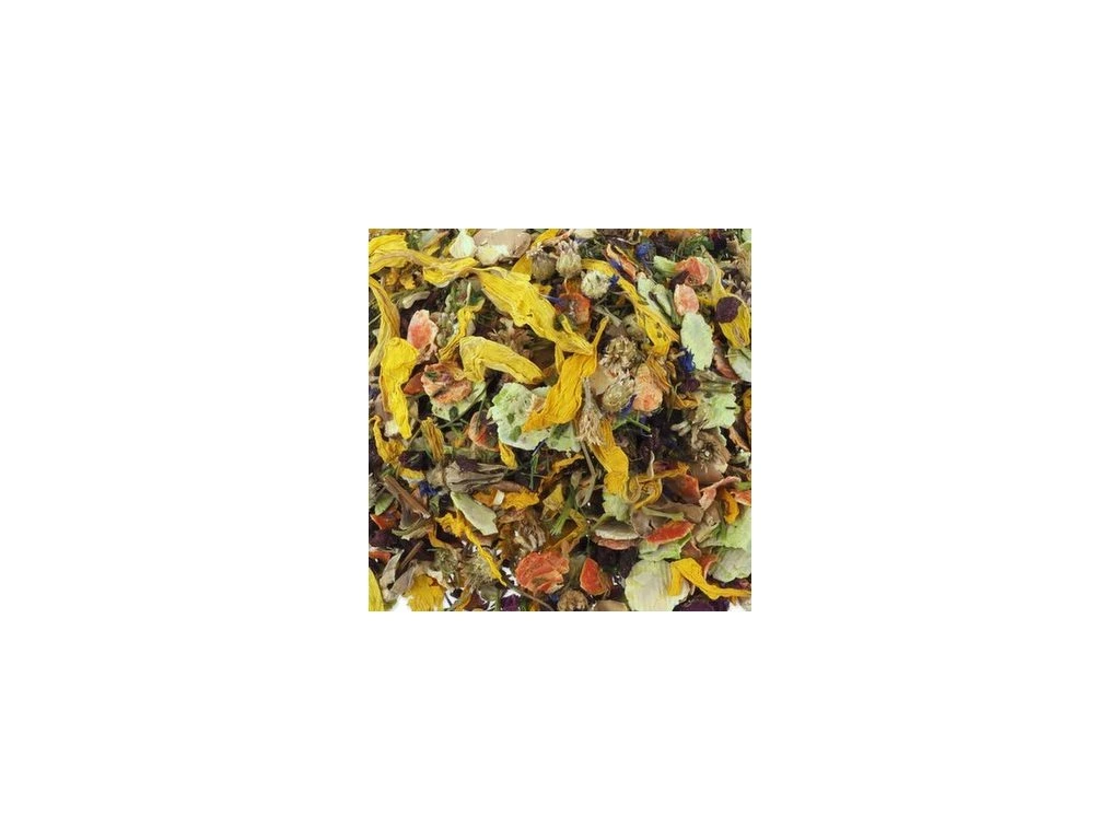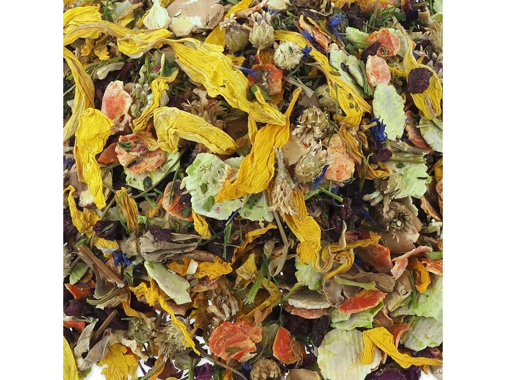Složení: Hrachové vločky 35 %, mrkvové vločky 17 %, vločky z koňského bobu 15 %, sušená červená řepa 5 %, sušený pastinák 5 %, sušené květy jitrocele 5 %, sušené květy chrpy 5 %, sušené květy měsíčku lékařského 5 %, sušená petržel 5 %, sušené květy červeného jetele 5 %, sušené okvětní lístky z růže 3 %.