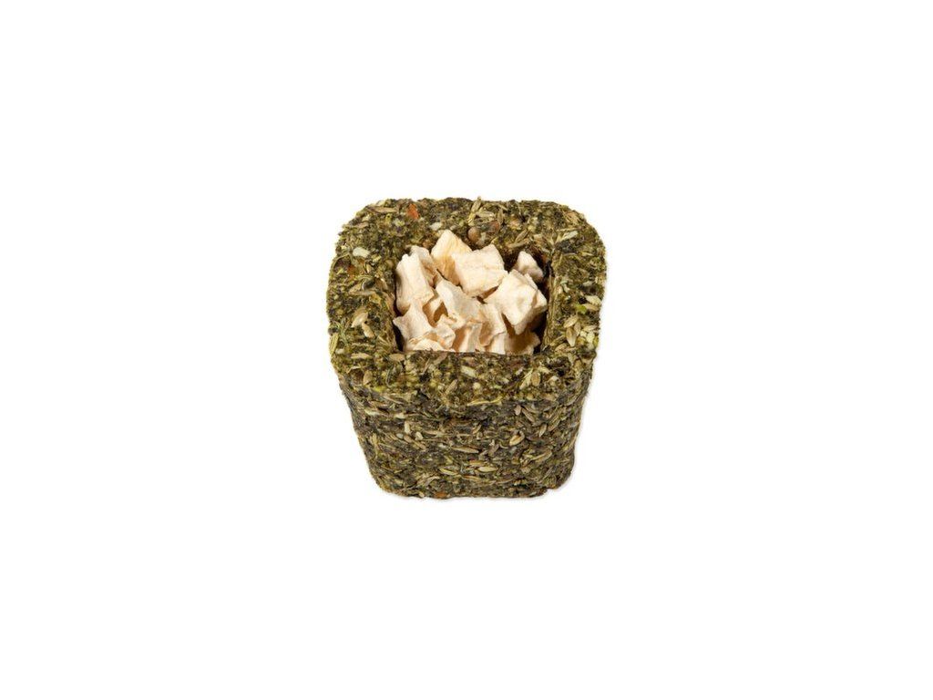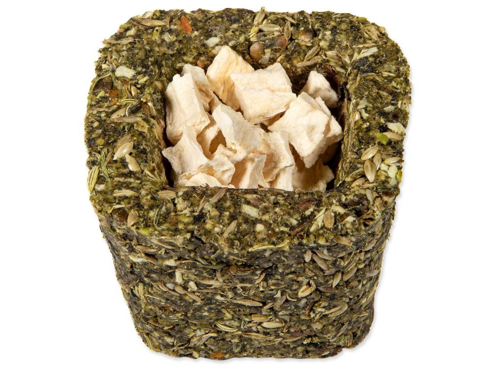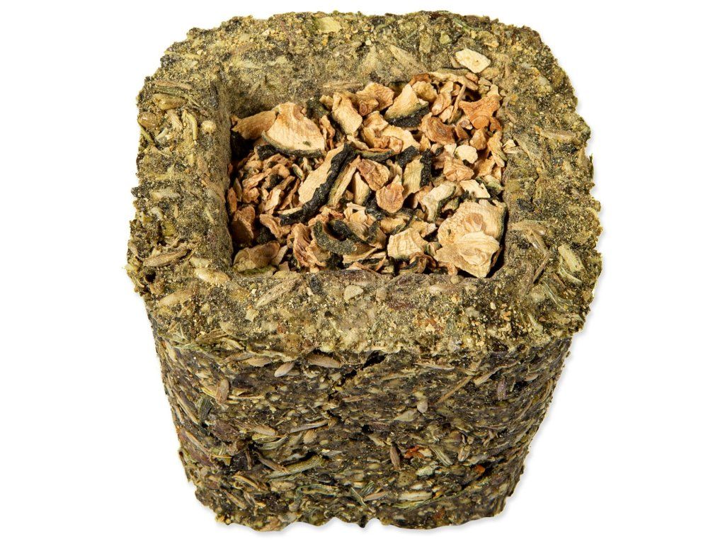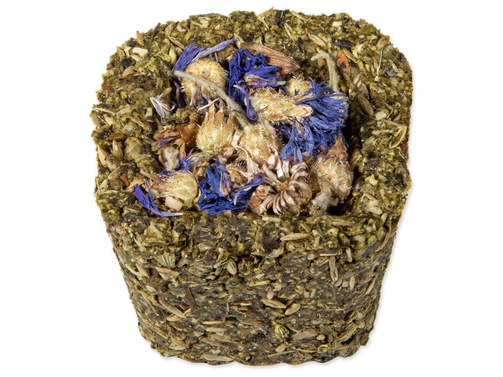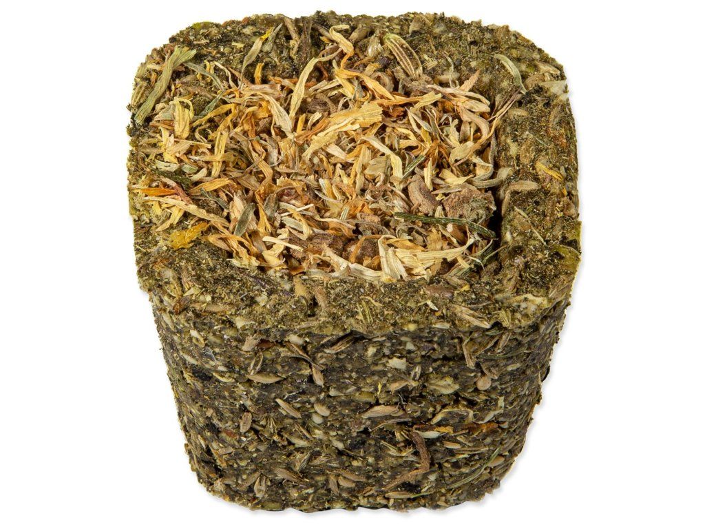 Složení: hrách, škrob, semena travin, semena kanárských travin, sušené kopřivy 4,8 %, pohanka, sušená petržel 1,8 %, sušená mrkev 1,7 % Náplň (sušená mrkev 0,4 %/ sušený pastinák 0,4 %/ sušená cuketa 0,4 %/ sušené okvětní lístky růže 0,3 %/ sušené květy měsíčku lékařského 0,3 %/ sušené květy chrpy 0,3 %), konopné semeno, lněné semeno, semena fenyklu, sušená máta peprná 1,2 %, sušená pampeliška 1 %, semena černého kmínu.