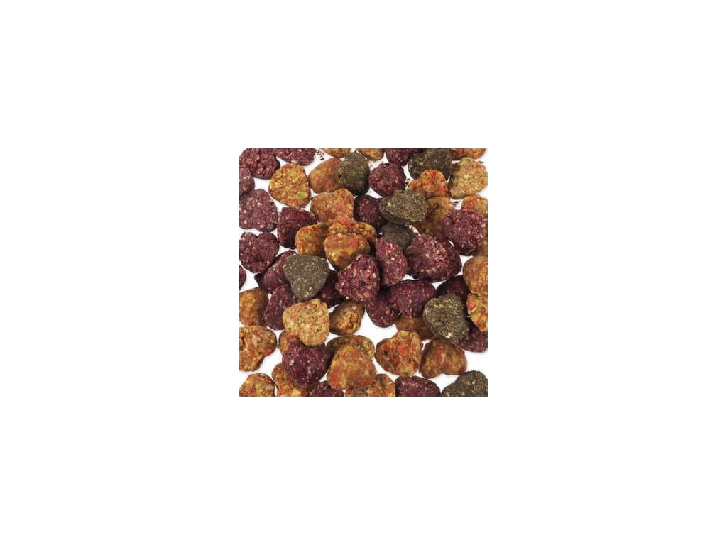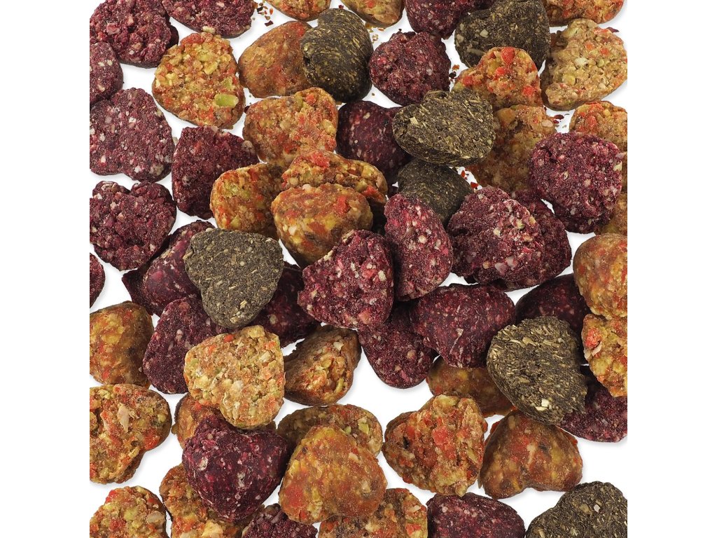 Bezobilné doplňkové krmivo pro králíky a hlodavce. Drobné pamlsky ve tvaru srdíček jsou velice chutným snackem pro vašeho mazlíčka. Barevnost výrobku je získána pouze z přírodních surovin a to z červené řepy, mrkve a sušených bylin, které, které zároveň podporují chutnost výrobku. Vzhledem ke svému složení je tento přírodní pamlsek velice vhodný pro králíky, morčata i činčily, ale bude chutnat také dalším druhům drobných hlodavců.