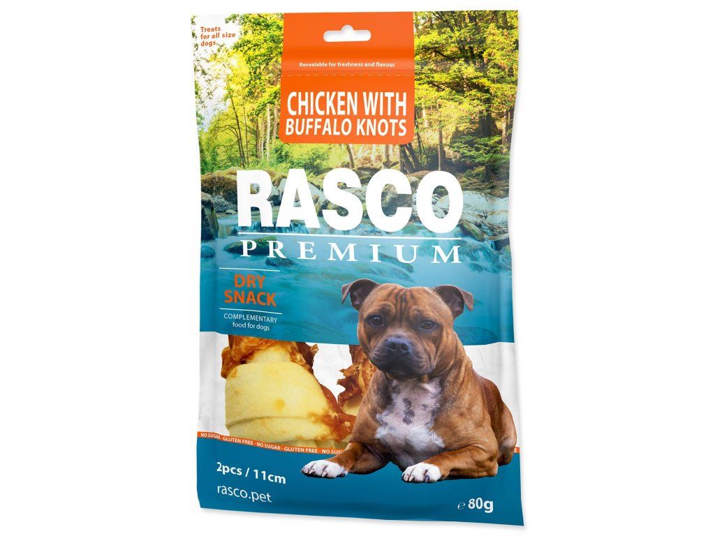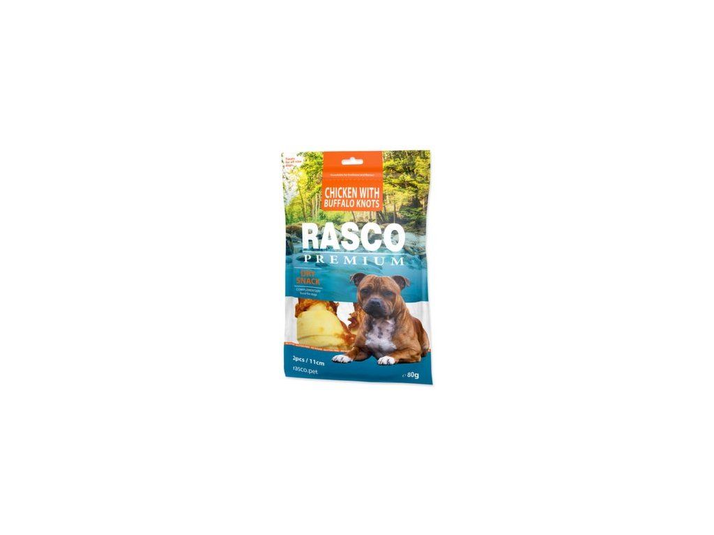 Pochoutka Rasco Premium buvolí kůže obalená kuřecím, uzly 11cm 80g