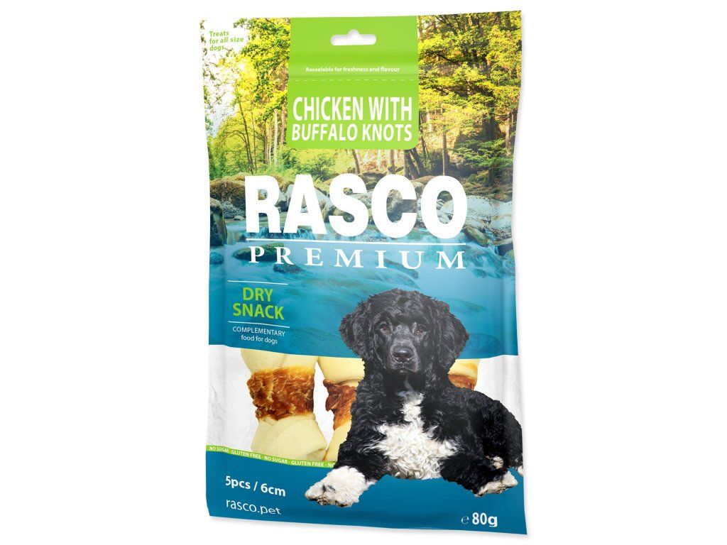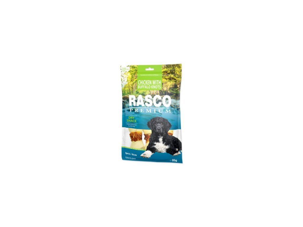 Pochoutka Rasco Premium buvolí kůže obalená kuřecím, uzly 6cm 80g