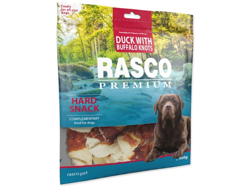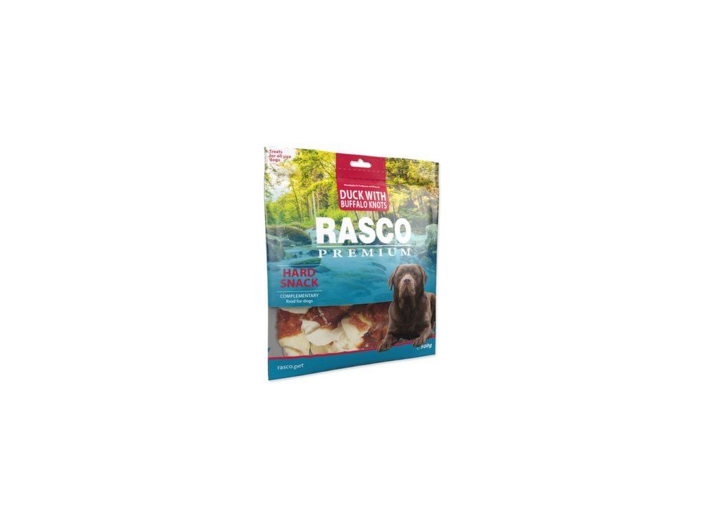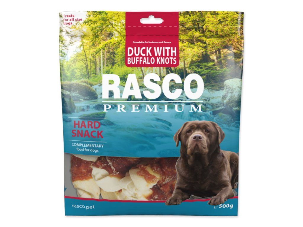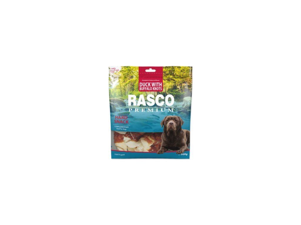 Pochoutka Rasco Premium buvolí kůže s kachním, uzly 5cm 500g