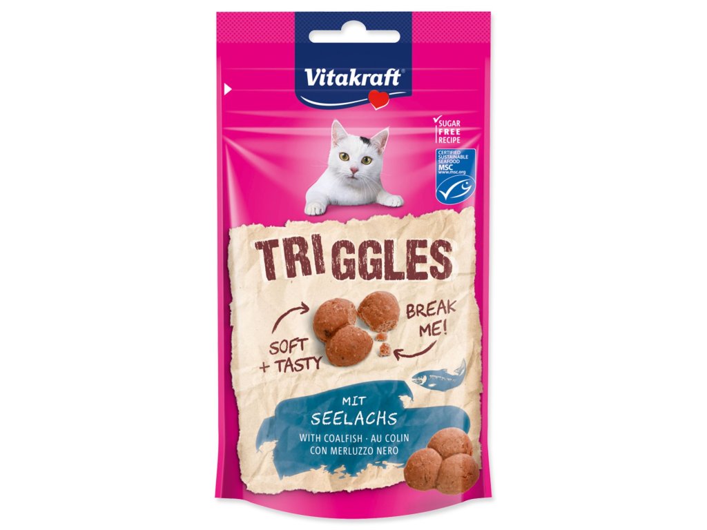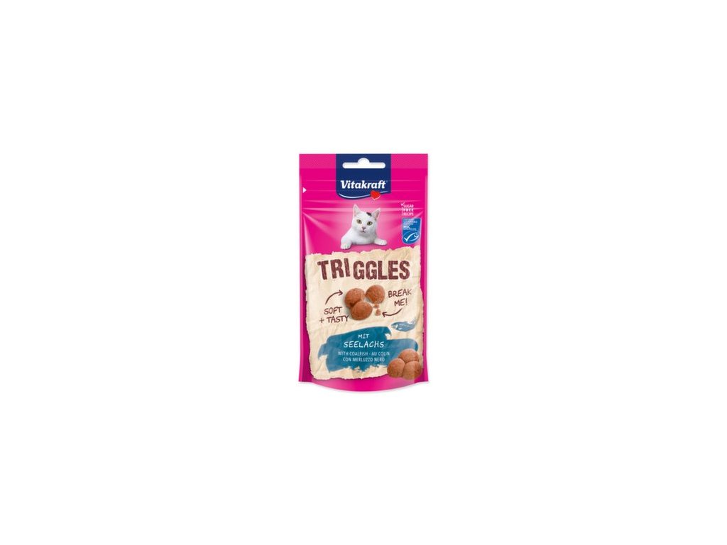 Chutný snack pro kočky Ideální jako výživný pamlsek k rozmazlování vašeho kočičího miláčka Originální trojitá forma: jeden kousek se skládá ze 3 částí, které můžete rozdělit. Triggles jsou měkké a delikatesní s lahodnou konzistencí, lákavou vůní i chutí a jsou navíc bez cukru.