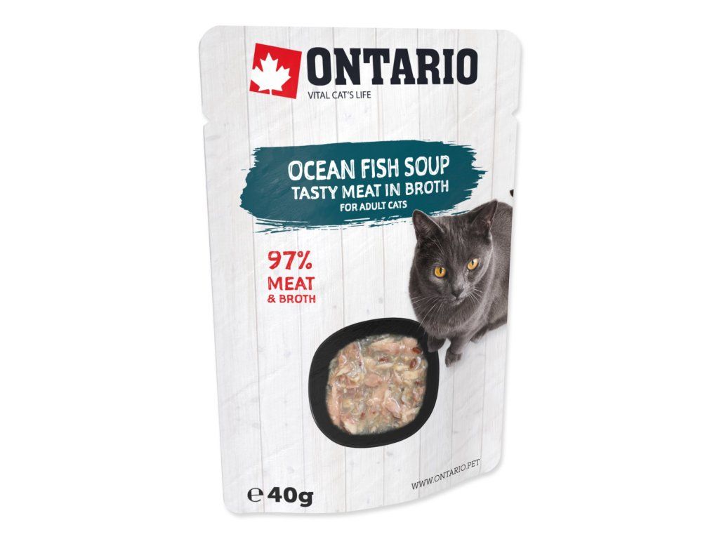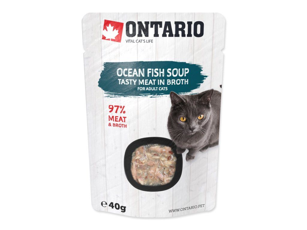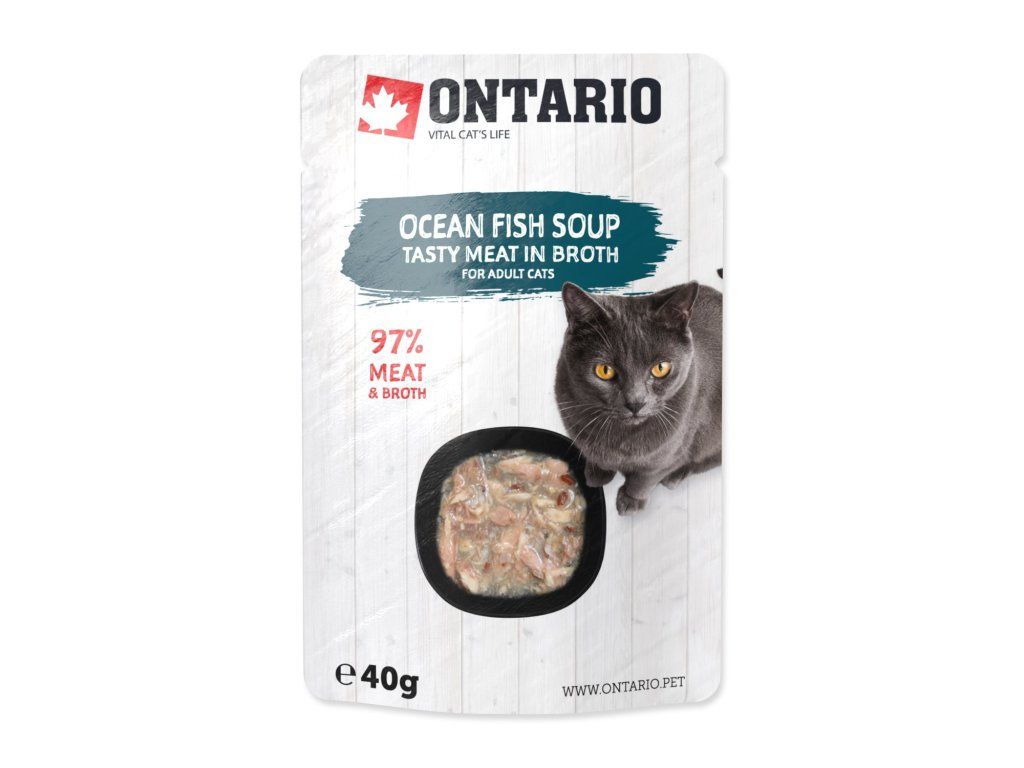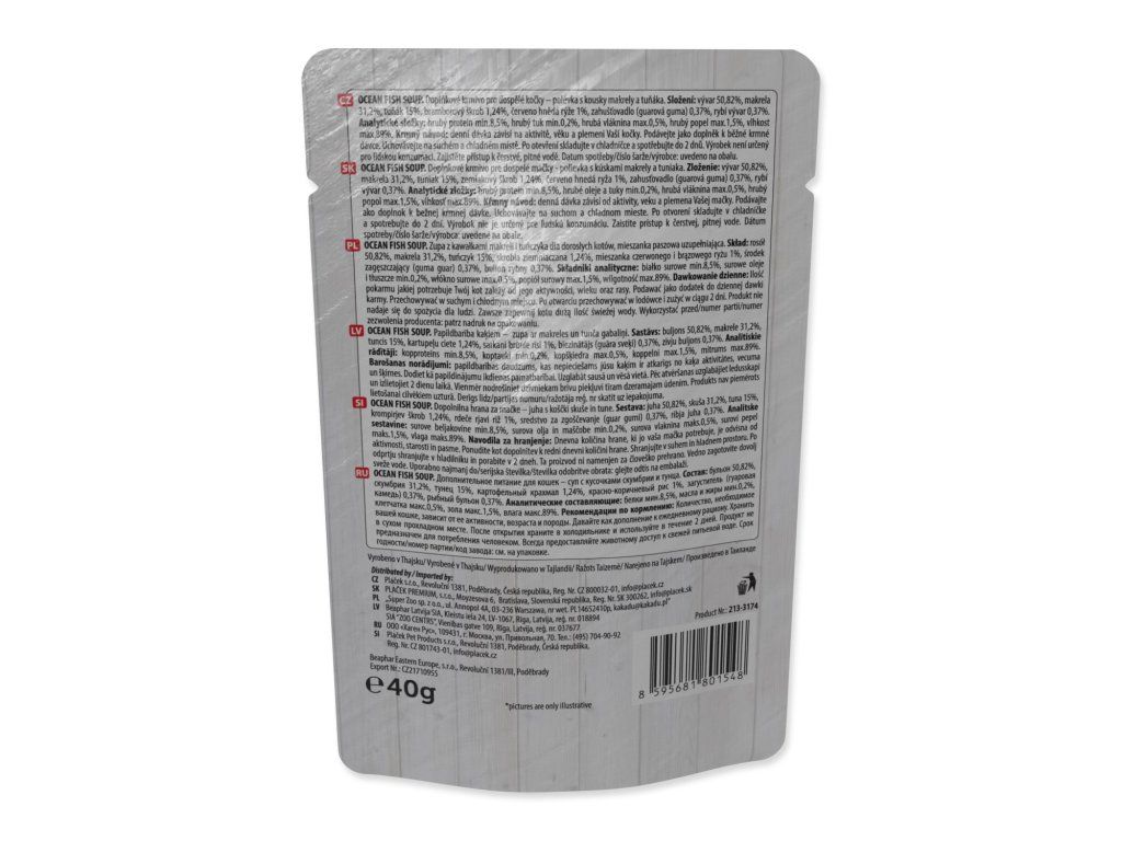 Doplňkové krmivo pro dospělé kočky – polévka s kousky makrely a tuňáka, kterou můžete dopřát samostatně nebo jako doplněk k suchému krmivu.