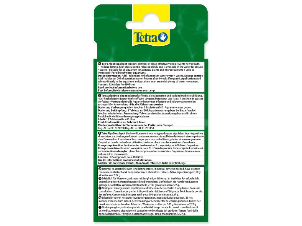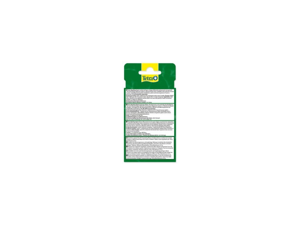 Také odolné štětinkovité a vlásečnicovité řasy budou spolehlivě zneškodněny, aniž by se ublížilo rybám nebo rostlinám. Dávkování: jako prevence: aplikujte 1 tabletu na 50 l vody do blízkosti vzduchovacího kamene. K odstranění stětinkovitých a vlásečnicovitých řas: dvojité dávkování. Tablety v sobě mají uloženou účinnou látku, která se postupně uvolňuje do akvária, ale nerozpouští se a udržují si svůj tvar. Po šesti týdnech už tablety žádnou účinnou látku neobsahují, a proto je z akvária vyjměte.