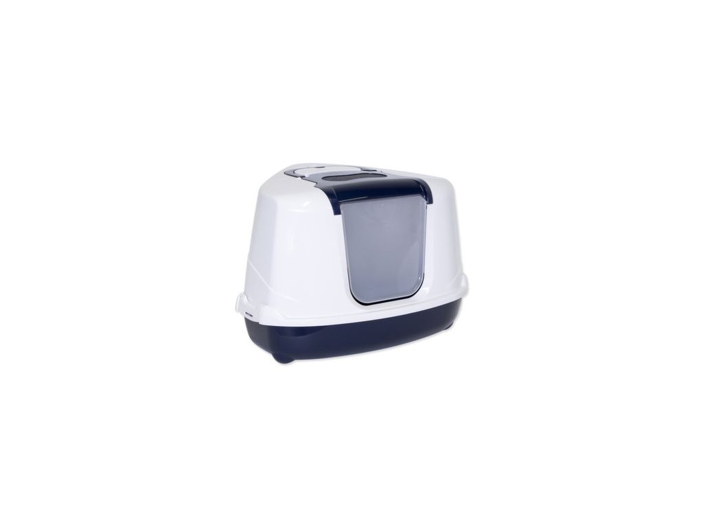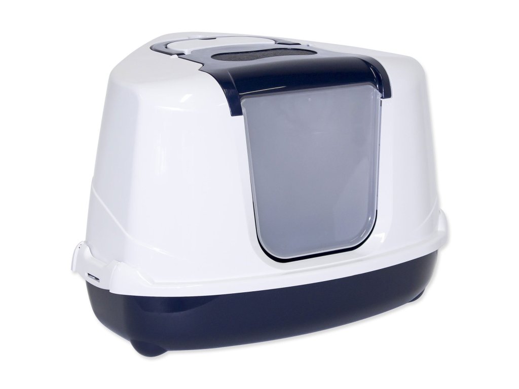 Rohová toaleta pro kočky s plastovým krytem, dvířky, filtrem a lopatkou.