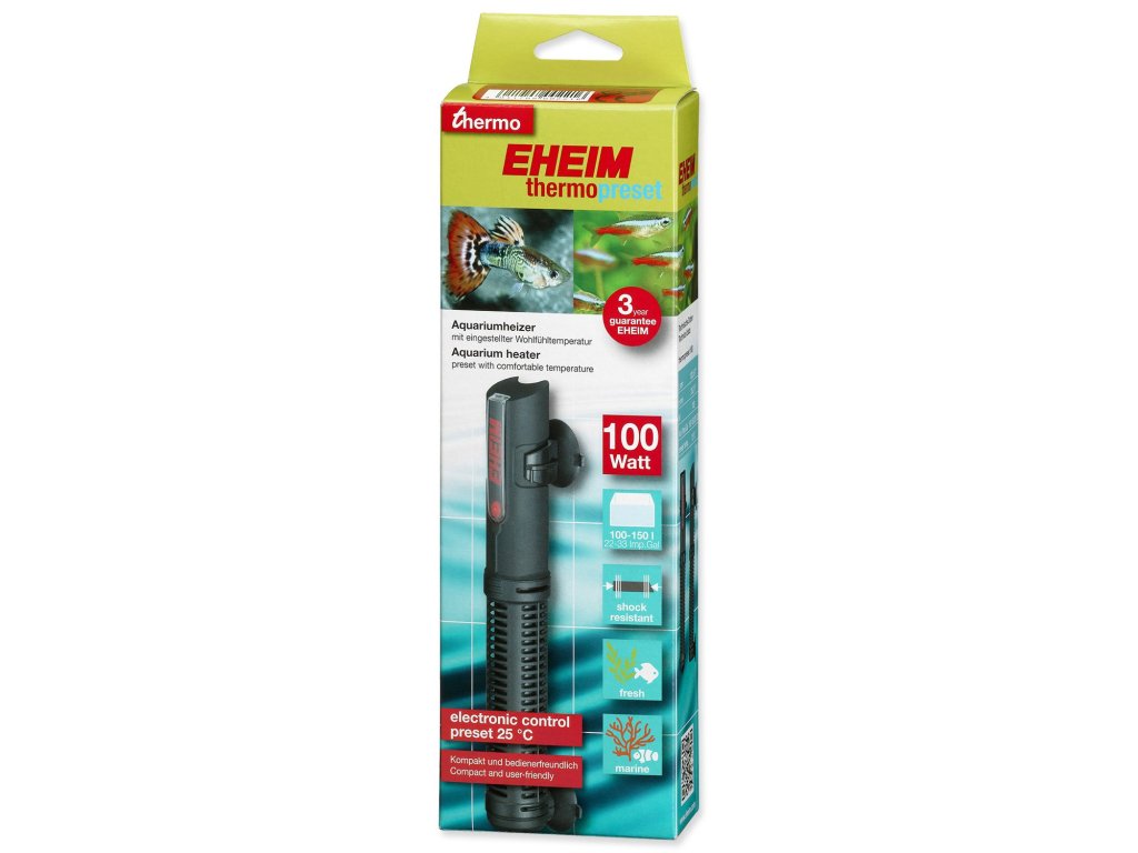 Topítko EHEIM Thermopreset se liší od topítka EHEIM Thermocontrol dodatečnou ochranou z plastu, která zajišťuje vysokou mechanickou stabilitu. Jako obvykle jsou topítka EHEIM vybaveny LED kontrolkou pro kontrolu funkce ohřevu a ochranou proti chodu za sucha. Výhody tepelného vytápění EHEIM: