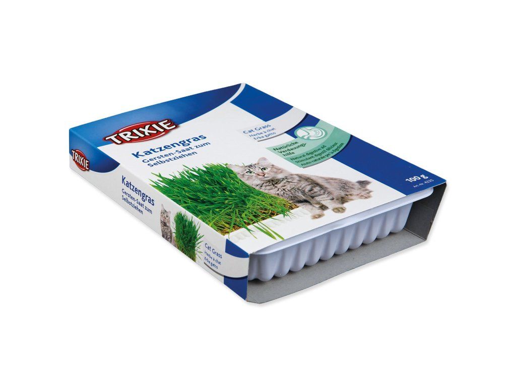 Tráva pro kočky je důležitá. Zlepšuje trávení u koček a zabraňuje tvorbě chlupových chulvalců. Osivem této trávy je vysoce kvalitní ječmen. Je vhodná pro kočky žijící doma. Balení obsahuje misku a směs substrátu a semen.