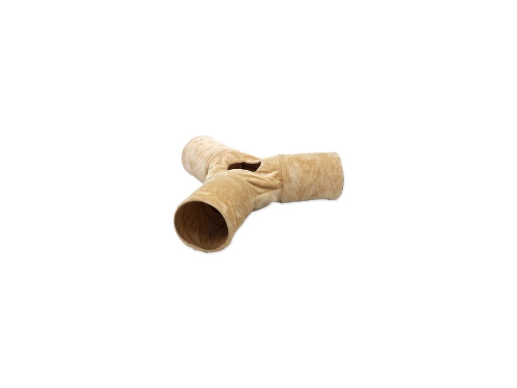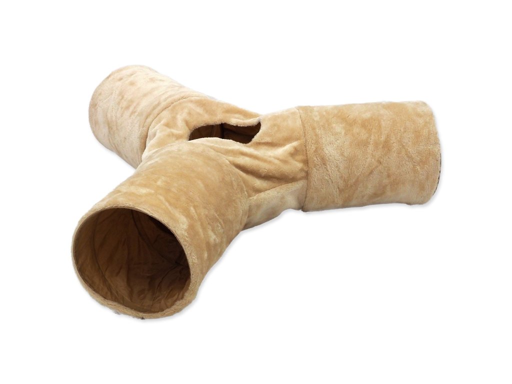 Tunel pro kočky se ve tvaru písmene „Y“ s otvorem uprostřed pro zábavnou hru.