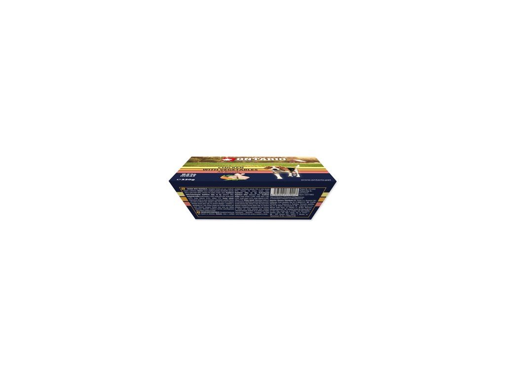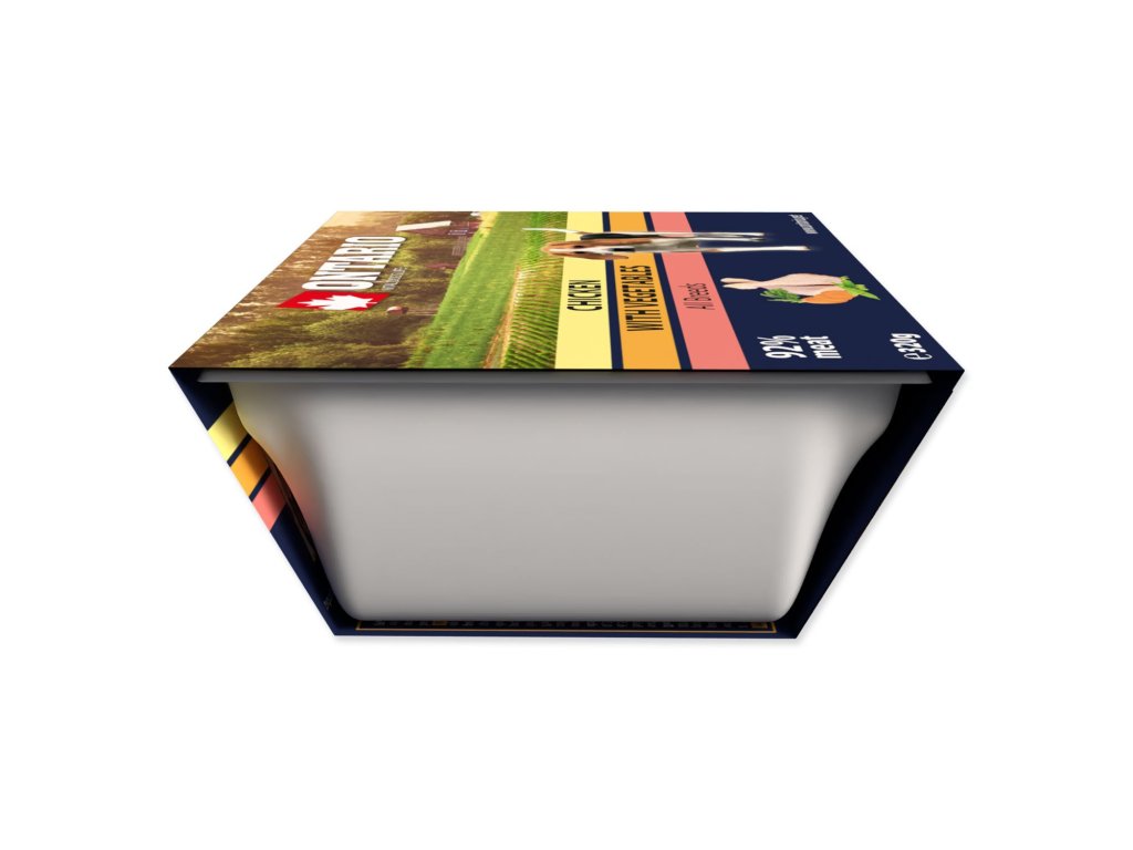 Složení: maso a vedlejší produkty živočišného původu 92% (z toho kuřecí 80%), zelenina 7% (mrkev, hrášek, celer).