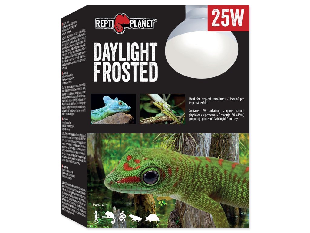 Žárovka REPTI PLANET Daylight Frosted poskytuje optimální poměr ultrafialového UVA záření, světelného záření a infračerveného (tepelného) záření a je ideální v kombinaci s UVB a nočními žárovkami (např. Repti Planet Repti UVB, Infrared Heat, Night Heat). Jedná se o širokospektrální žárovku, která podporuje fyziologické procesy jako je např. aktivita, příjem potravy a rozmnožování. Studené barevné spektrum imituje světlo v tropických oblastech a deštných pralesích. Žárovka je vhodná např. pro tropické žáby, gekony a ještěry.