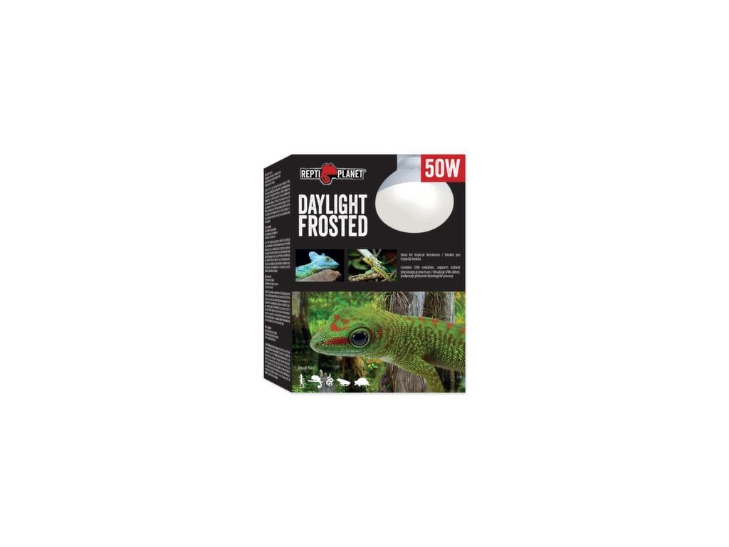 Žárovka REPTI PLANET Daylight Frosted poskytuje optimální poměr ultrafialového UVA záření, světelného záření a infračerveného (tepelného) záření a je ideální v kombinaci s UVB a nočními žárovkami (např. Repti Planet Repti UVB, Infrared Heat, Night Heat). Jedná se o širokospektrální žárovku, která podporuje fyziologické procesy jako je např. aktivita, příjem potravy a rozmnožování. Studené barevné spektrum imituje světlo v tropických oblastech a deštných pralesích. Žárovka je vhodná např. pro tropické žáby, gekony a ještěry.